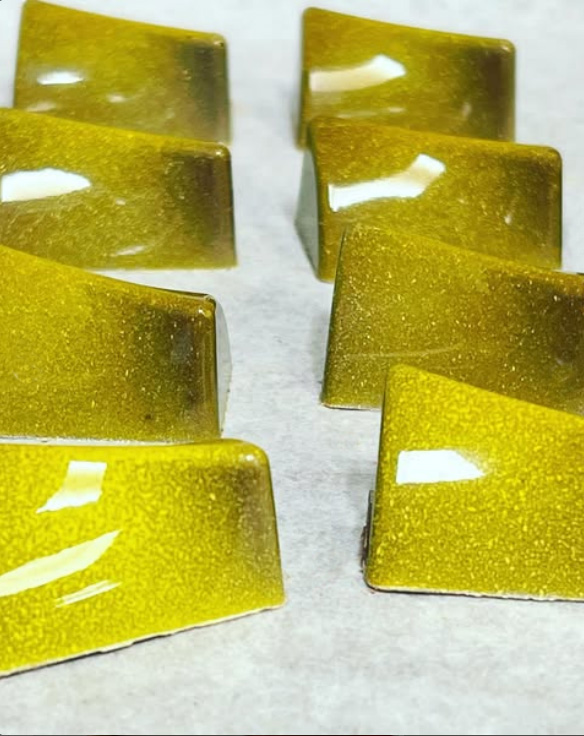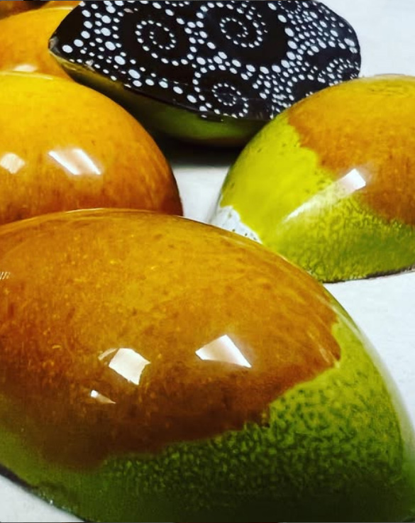 When we make our own transfer sheet designs, first liquefy your cocoa butter, then use a pastry brush and brush your design onto the acetate